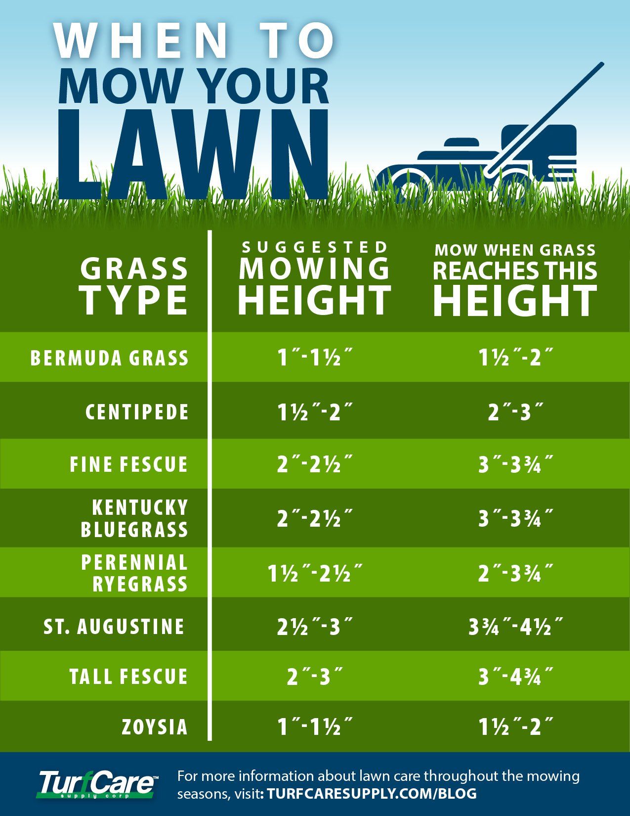 - TIP: For mowing in the heat of summer, follow the one-third rule but let your grass grow roughly .5 of an inch higher than the recommended cutting height. Never remove more than one-third of your grass height at one time because this will lead to more stress, potential scalping of the lawn and/or disease. Research the type of grass in your region and follow the chart below to help determine when to mow your summer stressed lawn.