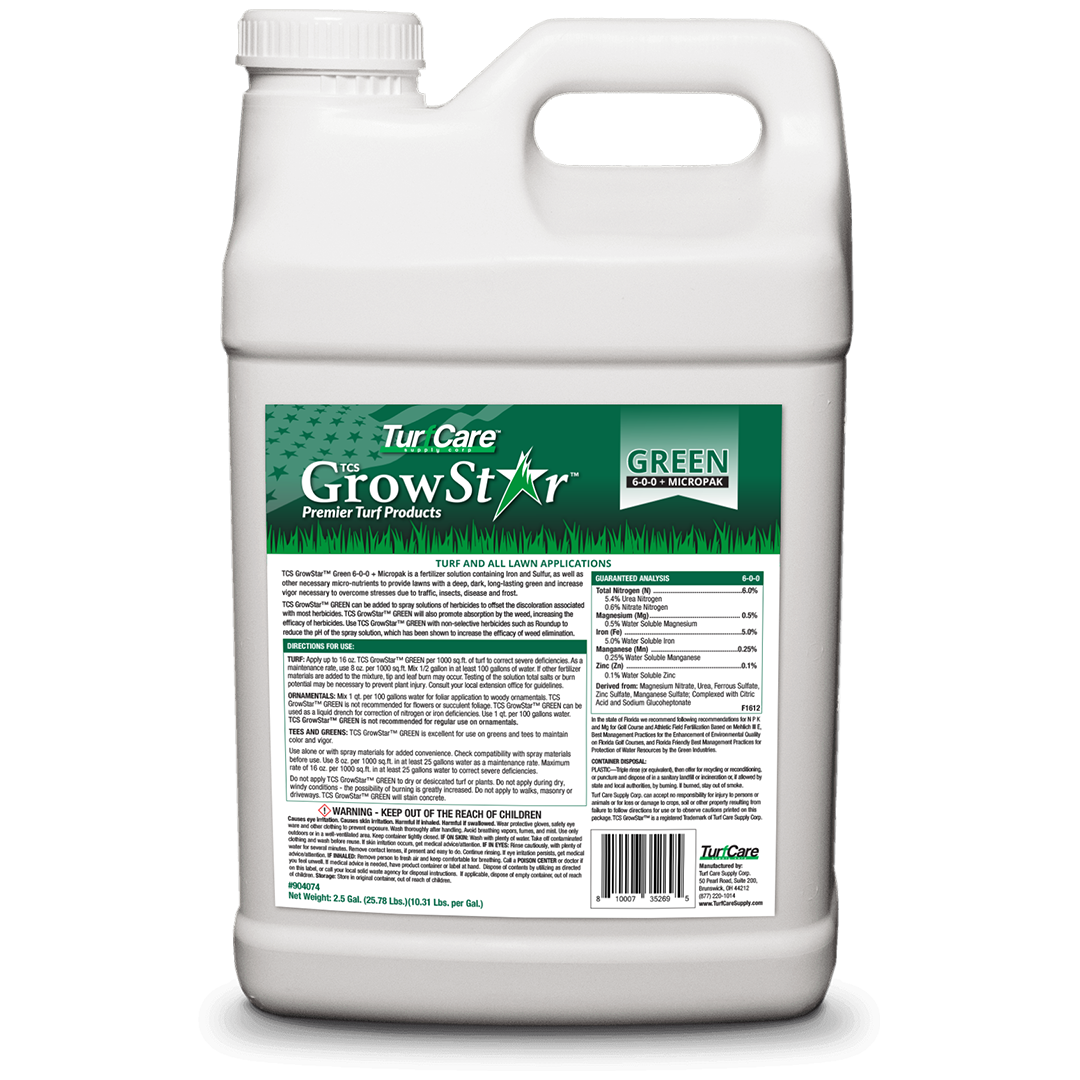 TCS GrowStar™ Green 6-0-0 + Micropack is a fertilizer solution containing Iron and Sulfur, as well as other necessary micro-nutrients to provide lawns with a deep, dark, long-lasting green and increase vigor necessary to overcome stresses due to traffic, insects, disease and frost.