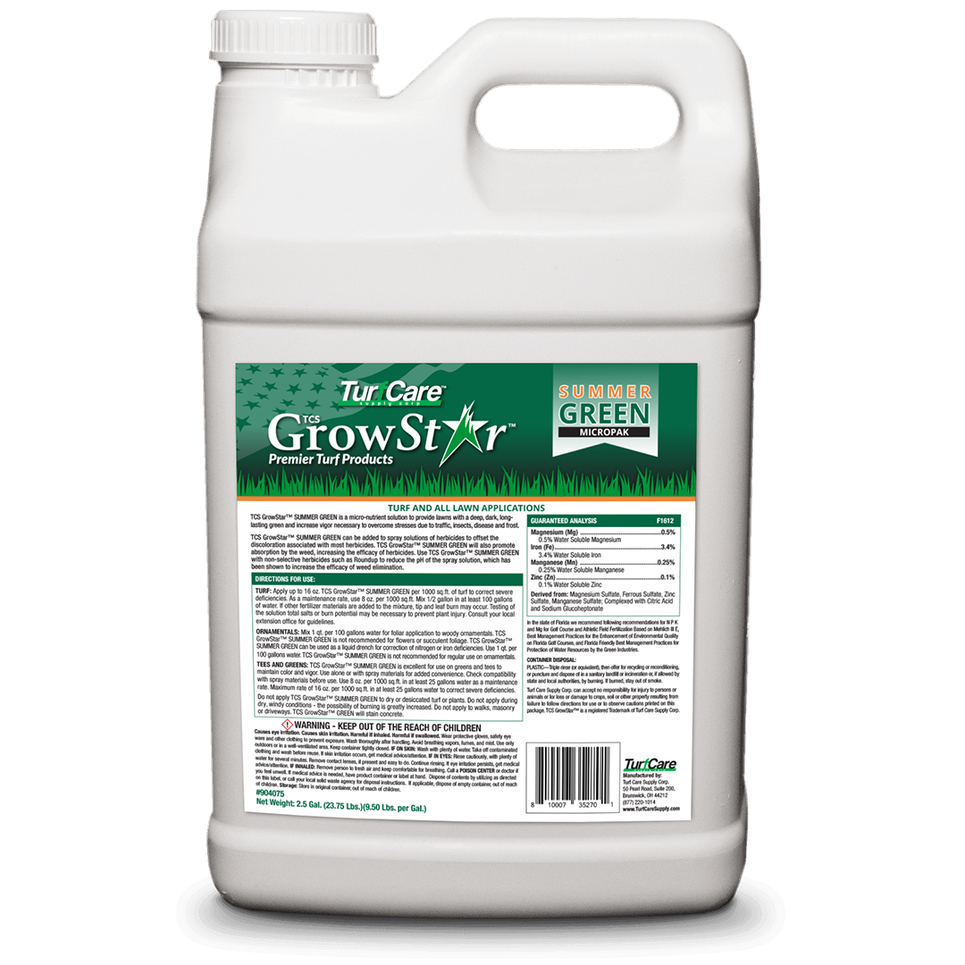 TCS GrowStar™ SUMMER GREEN is a micro-nutrient solution to provide lawns with a deep, dark, long-lasting green and increase vigor necessary to overcome stresses due to traffic, insects, disease and frost.