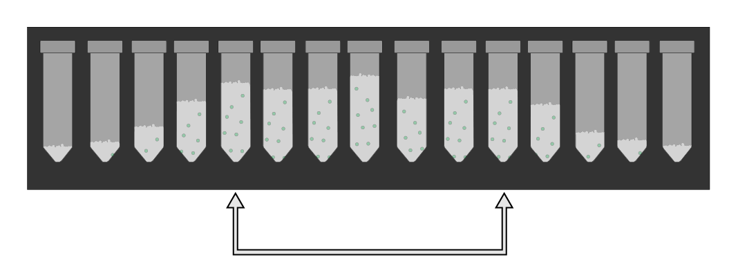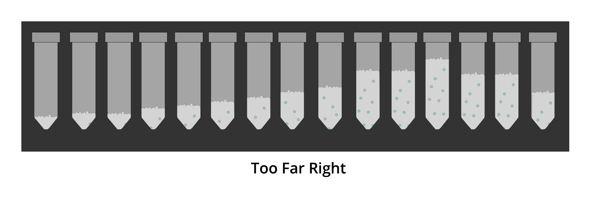 - First, of the collected product in containers, find the two containers on either side of the center container that have about half the product of the center container.
