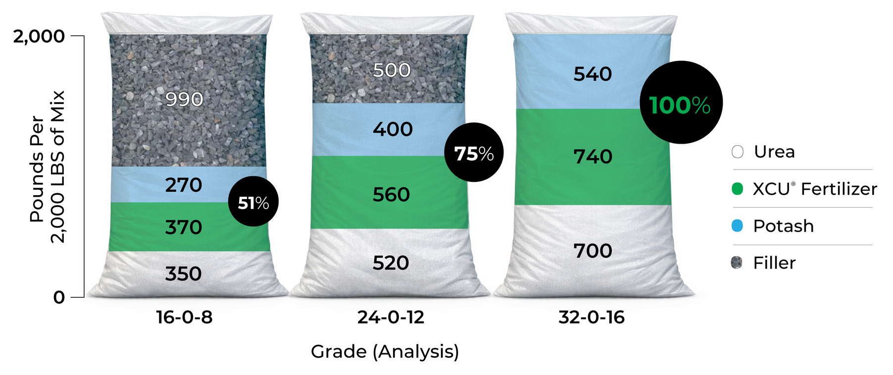 Many granular fertilizer blends contain at least some filler. A filler is any raw material that doesn’t carry any nutrient or soil amending value. In most cases, screened limestone is used as filler due to its relatively low cost. Filler is typically used to keep the unit price of a fertilizer down while also helping to spread low analysis blends more evenly across an application area, however a simple cost-analysis reveals that filler is not your friend when it comes to providing ROI or agronomic value.