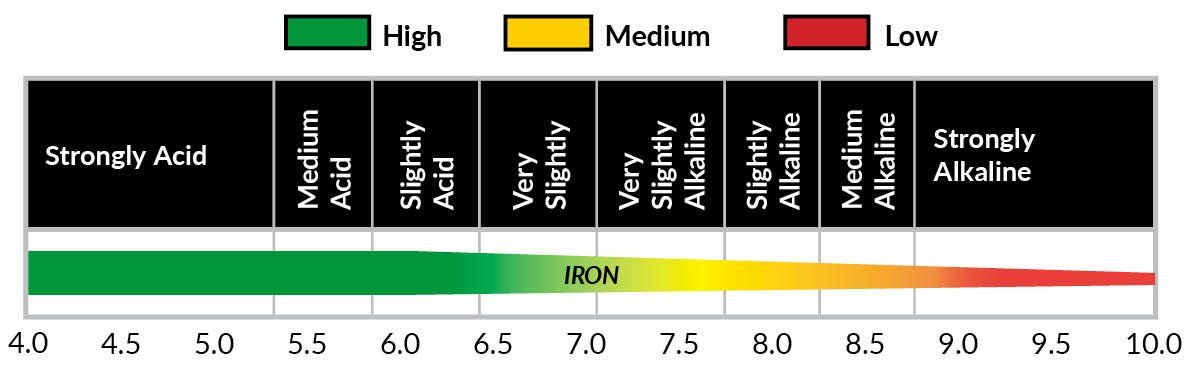 SOIL pH IMBALANCES Iron becomes readily available in a soil where pH is 6.0. Liming acidic soils is a necessity in order to optimize turf health but an overload of applications can cause iron deficiencies.