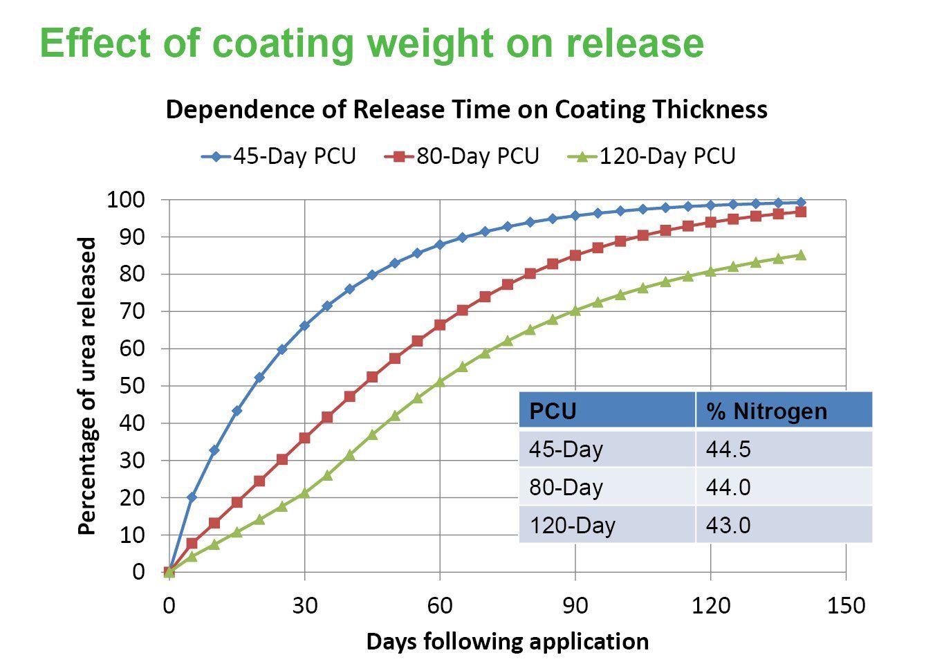 In the graph to the right, look at the release curves for 3 generic PCU (polymer coated urea)products. The thicker the polymer coating, the straighter the release curve (this is preferred). Notice that the 45-Day PCU has released about 80% of its urea in 45 days. Conversel y, the 120-Day PCU has only released about 38% of its urea in 45 days. SRNs with longer and straighter release curves usually have a thicker polymer coating or multiple polymer/sulfur coatings (with or without wax) and are generally more expensive. Note that over time the curves begin to level off. Some coated urea fertilizers are so effective at repelling water that some of the nitrogen remains trapped in the granule indefinitely. This problem is known as “lock-off.” Also note that thicker coatings will translate into slightly diminished guaranteed analyses for nitrogen content.